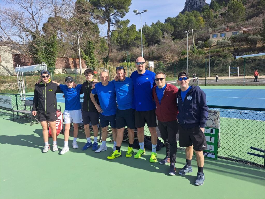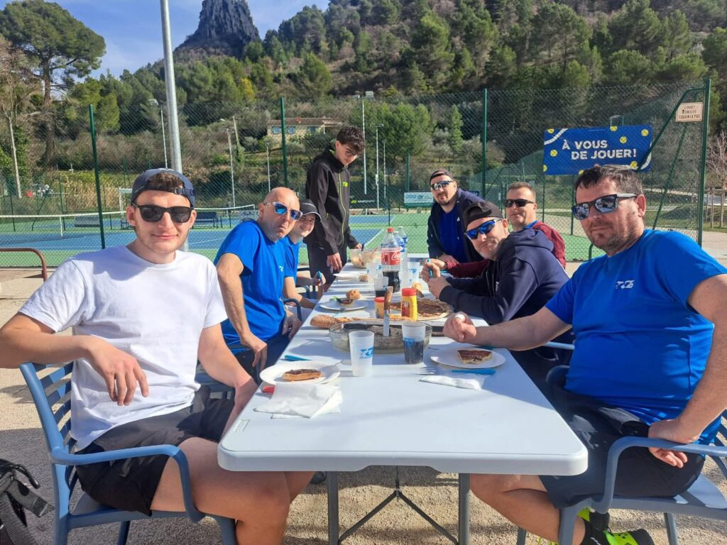 L’équipe 1 « Hommes » recevait à domicile le club de Châteauneuf du Rhône. Les buxois gagnent la rencontre 3-2 avec la victoire de Simon, Ludo et Sylvain en simple. Malheureusement, Paulin perd son simple et Nael et Ludo le double, mais cela n’a pas enlevé la victoire à notre équipe ! Merci à nos nombreux supporters présents sur les courts ! Un bon repas au soleil a été partagé après ces beaux matchs !
